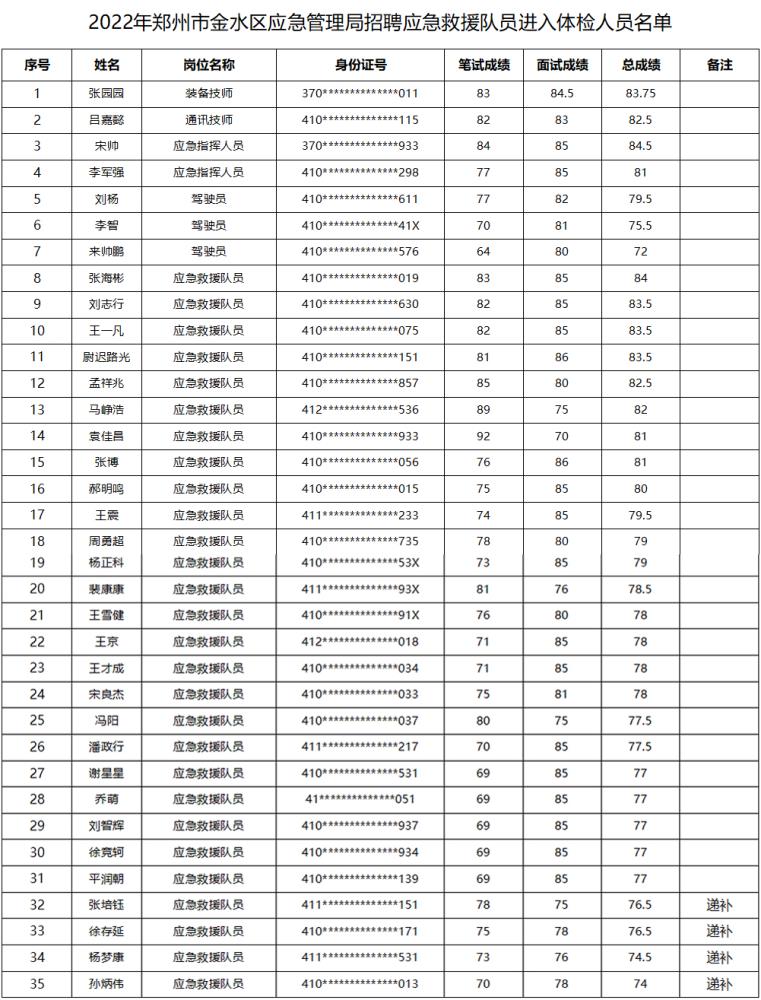 根據《2022年鄭州市金水區應急管理局招聘應急救援隊員公告》的相關(guān)要求,面試工作已經(jīng)結束,考生可于2022年4月14日09:00自行登錄報名網(wǎng)站www.zyksy.com查詢(xún)本人面試成績(jì)?,F將2022年鄭州市金水區應急管理局招聘應急救援隊員體檢工作有關(guān)事宜通知如下: